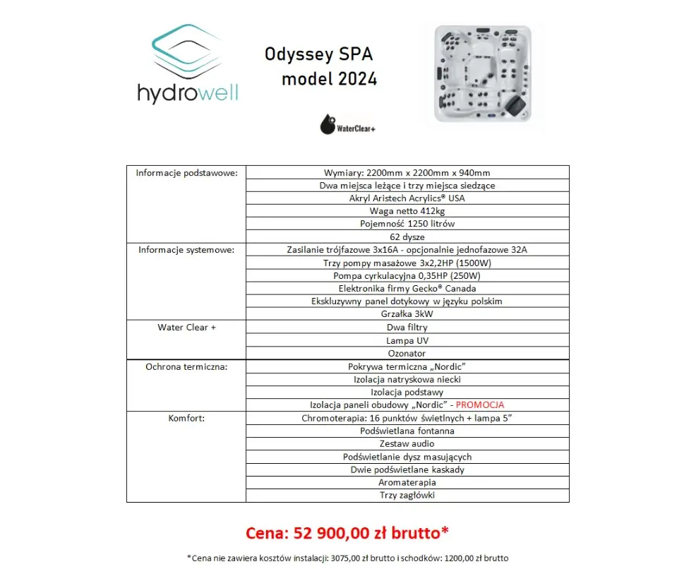 Hydrowell ODYSSEY SPA Nowość w ofercie Hydrowell Basen może być używany zarówno w salonie kąpielowym jak i w ogrodzie. Dodatkowa izolacja termiczna niecki i podstawy oraz dołączona w komplecie pokrywa termiczna, umożliwiają energooszczędną eksploatację urządzenia zimą. System Water Clear+ to połączenie wydajnych filtrów, lampy UV oraz ozonatora. Obsługa basenu jest wyjątkowo prosta – intuicyjny panel sterujący i elektronika sterująca od Balboa® gwarantują bezproblemową pracę hydromasażu, a kompozytowa obudowa jest dodatkowo podświetlana – aż 12 kolorów do wyboru. Elegancki design, funkcjonalność i wygoda basenu ODYSSEY SPA, jest gwarancją udanego wypoczynku, ale także świetnych spotkań z przyjaciółmi. To coraz częściej wybierany do ogrodów i domów jednorodzinnych sprzęt relaksacyjny. Szczególnie polecany jest dla osób trenujących i aktywnych fizycznie, ale również dla osób ceniących sobie przyjemny wypoczynek oraz osób starszych, którym wypoczynek w wodzie przynosi ulgę i pomoc w leczeniu. Nieckę basenu tworzy najwyższej jakości akryl firmy Aristech Acrylics® wykazujący wysoką odporność na warunki atmosferyczne i promieniowanie UV Informacje podstawowe: Wymiary: 2200mm x 2200mm x 940mm Dwa miejsca leżące i jedno miejsce siedzące Akryl Aristech Acrylics® USA Waga netto 450 kg Pojemność 1150 litrów 60 dysz Informacje systemowe: Zasilanie trójfazowe 3x16A - opcjonalnie jednofazowe 32A Trzy pompy masażowe 3x2,0HP Pompa cyrkulacyjna 0,5HP Elektronika firmy Gecko® Canada Nowoczesny panel sterujący w języku polskim Grzałka 3kW Water Clear + Dwa filtry Lampa UV Ozonator Ochrona termiczna: Pokrywa termiczna „Nordic” Izolacja natryskowa niecki Izolacja podstawy Izolacja paneli obudowy „Nordic” - PROMOCJA Komfort: Chromoterapia Podświetlane narożniki obudowy Podświetlana fontanna Aromaterapia Pięć zagłówków