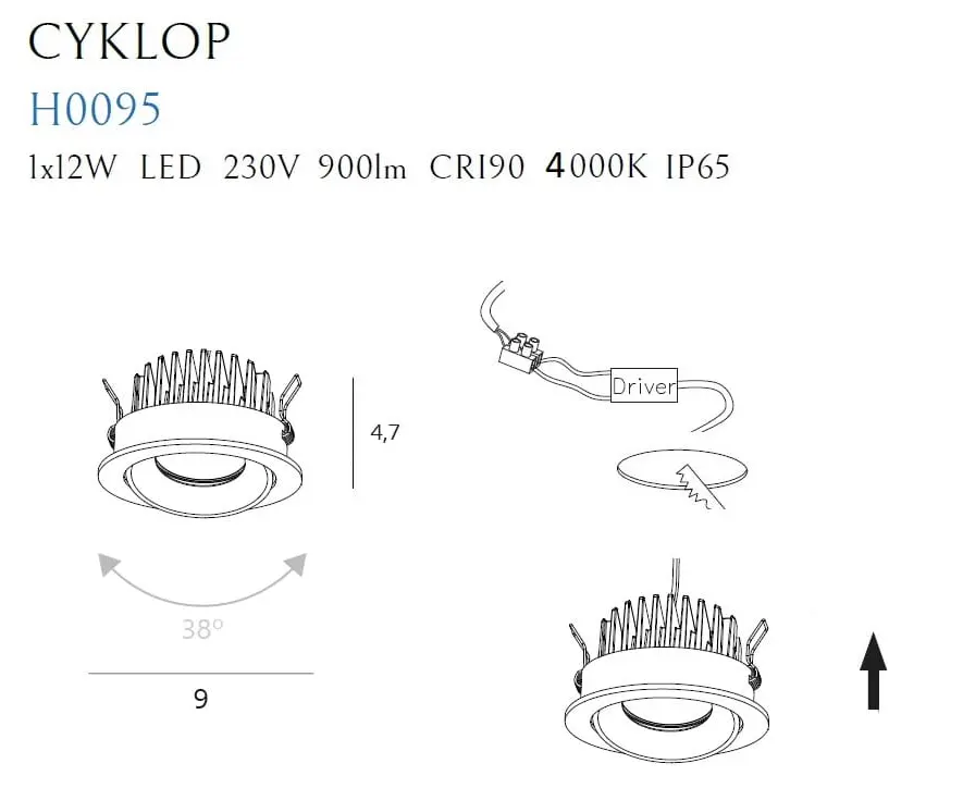 H: 4,7 cm, Ø: 9,0 cm, Kąt świecenia/beam angle: 38°
