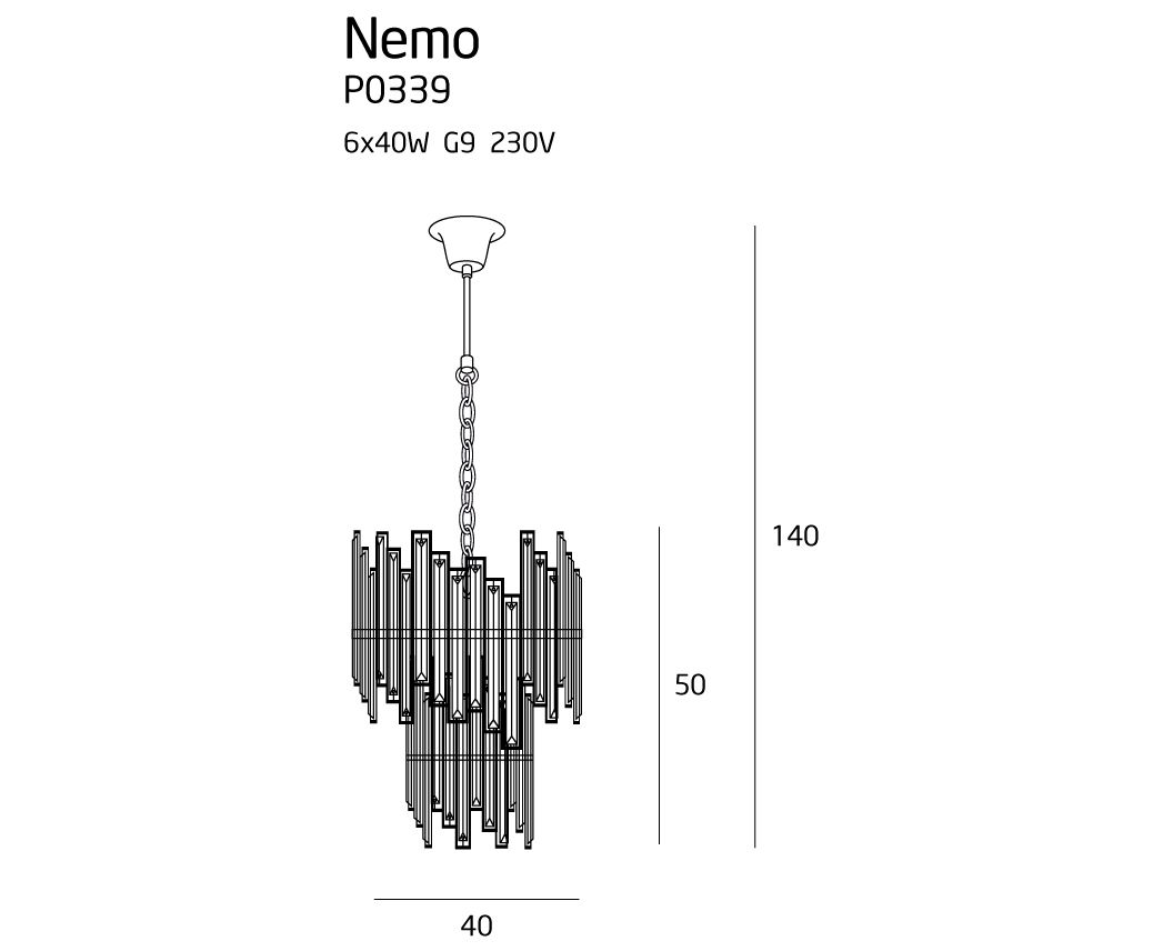 Ten wyjątkowy żyrandol przywodzi na myśl luksusowy, awangardowy złoty naszyjnik. Jego nieregularny układ w połączeniu z klasyczną, okrągłą ramą stwarza wrażenie pieczołowicie dobranej szczypty szaleństwa. Każdy kawałek ciętego szkła jest obramowany połyskującym metalem. Żyrandole i kinkiet Nemo zachwycą osoby, które kochają oryginalne detale, ale doceniają sprawdzone, konwencjonalne rozwiązania.