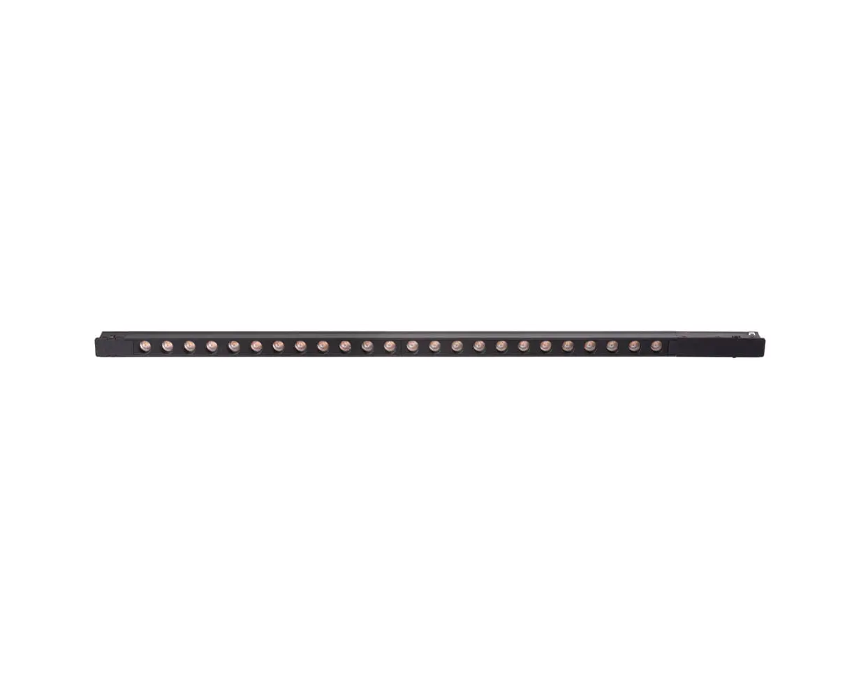 Moc: 23,2 W Typ źródła światła: LED Źródło światła: zintegrowane Barwa światła: 3000K (ciepła biel) Strumień świetlny: 1734 lm CRI (Ra): 92 Kąt świecenia: 27° Ilość źródeł światła: 24 Ściemnianie: nie Napięcie: 48V DC Wymiary: długość 57 cm, szerokość 1 cm, wysokość 1 cm Materiał: aluminium Wykończenie / kolor: czarny Klasa szczelności: IP20