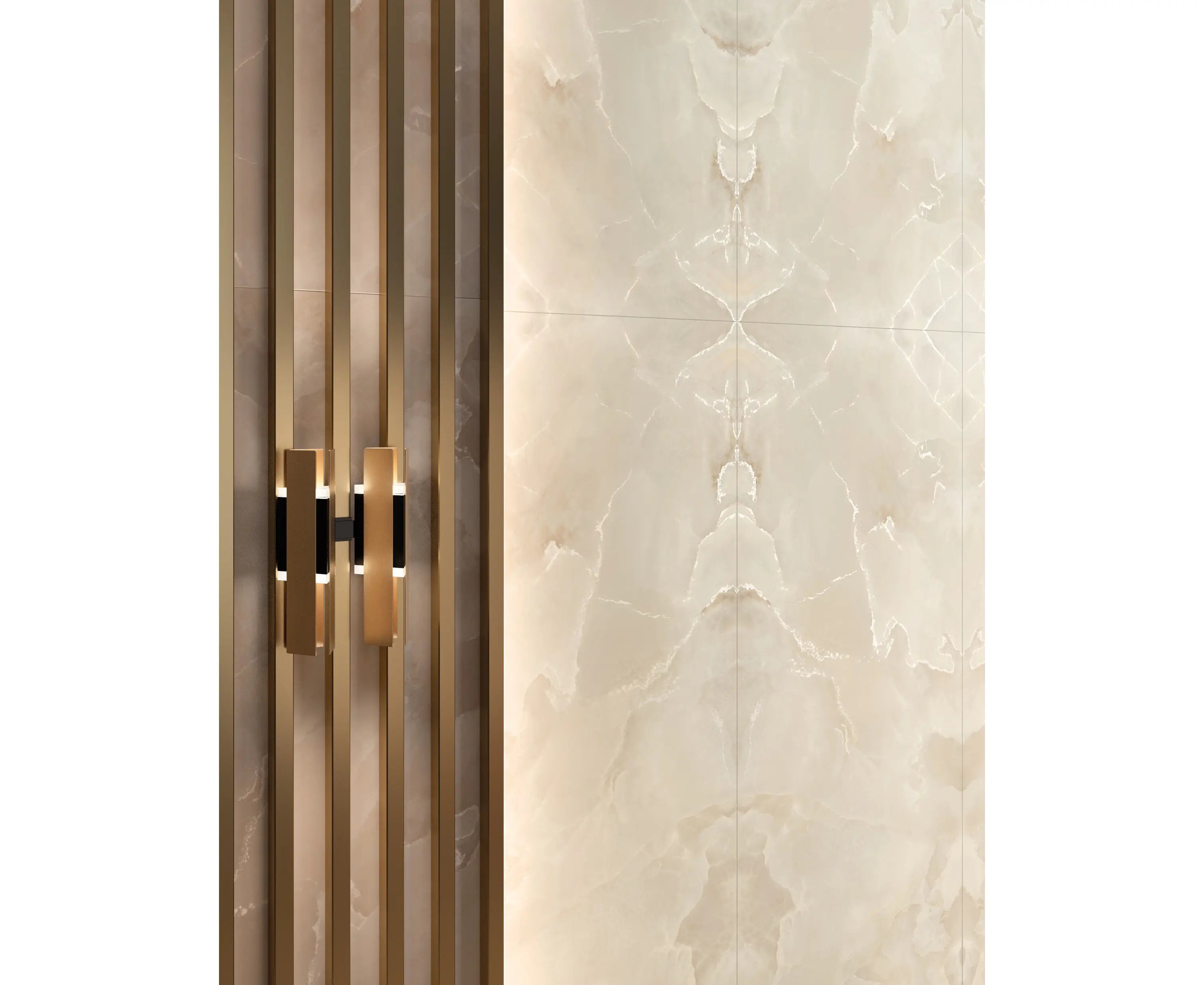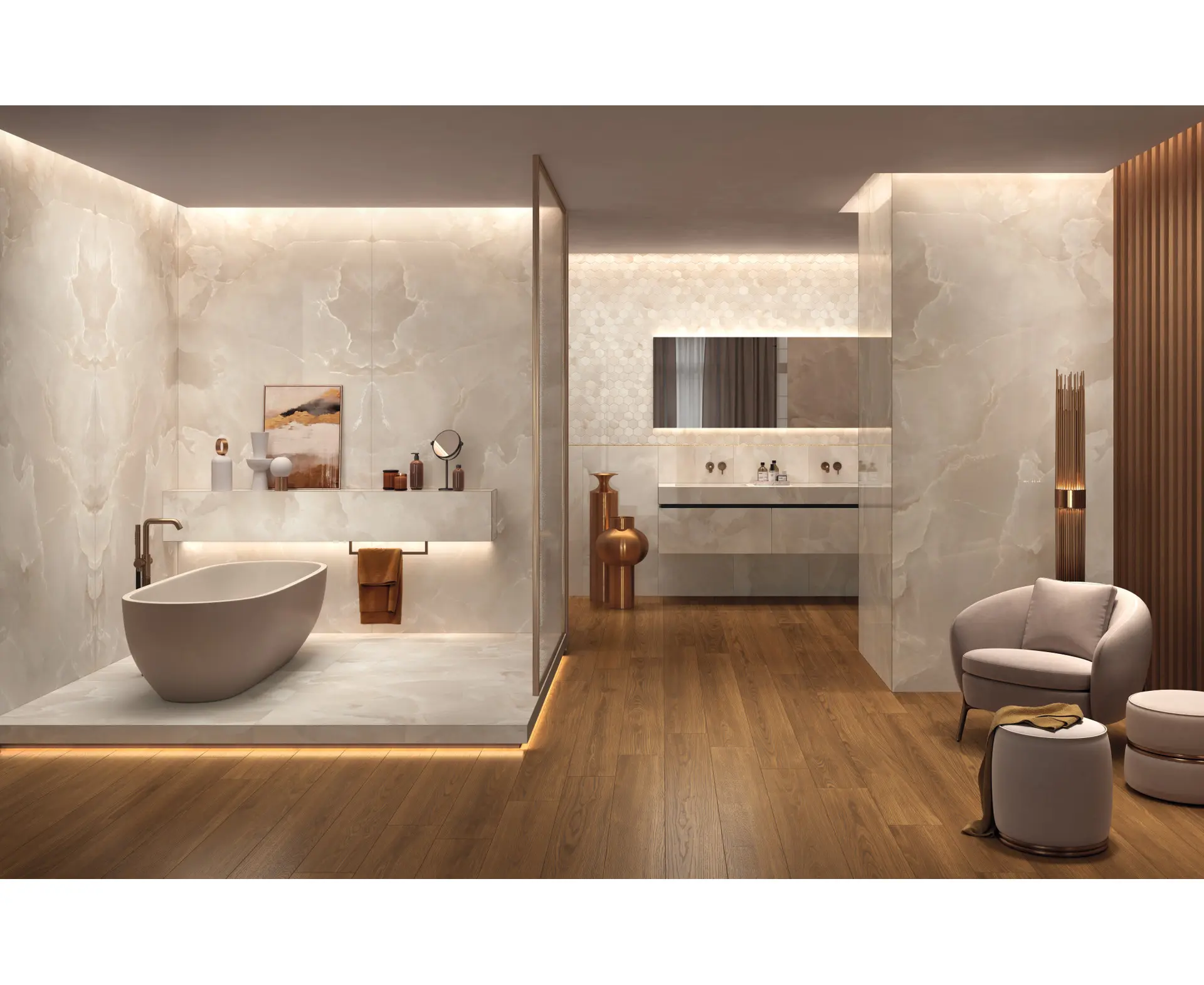 W porównaniu do płytek standardowych rozmiarów (np. 60×120 cm, 60×60 cm) model 120×120 cm zapewnia mniej przerw wizualnych, co skutkuje płynnością wzoru i przestrzenią wizualną. Odcień „Coconut” przypomina naturalny onyks/marmur, ale w formacie gresu – co oznacza pełną funkcjonalność zamiast właściwości marmuru naturalnego (mniej chłonności, większa odporność). Powierzchnia rektyfikowana pozwala zastosować bardzo cienką fugę, co dodatkowo podnosi efekt elegancji.