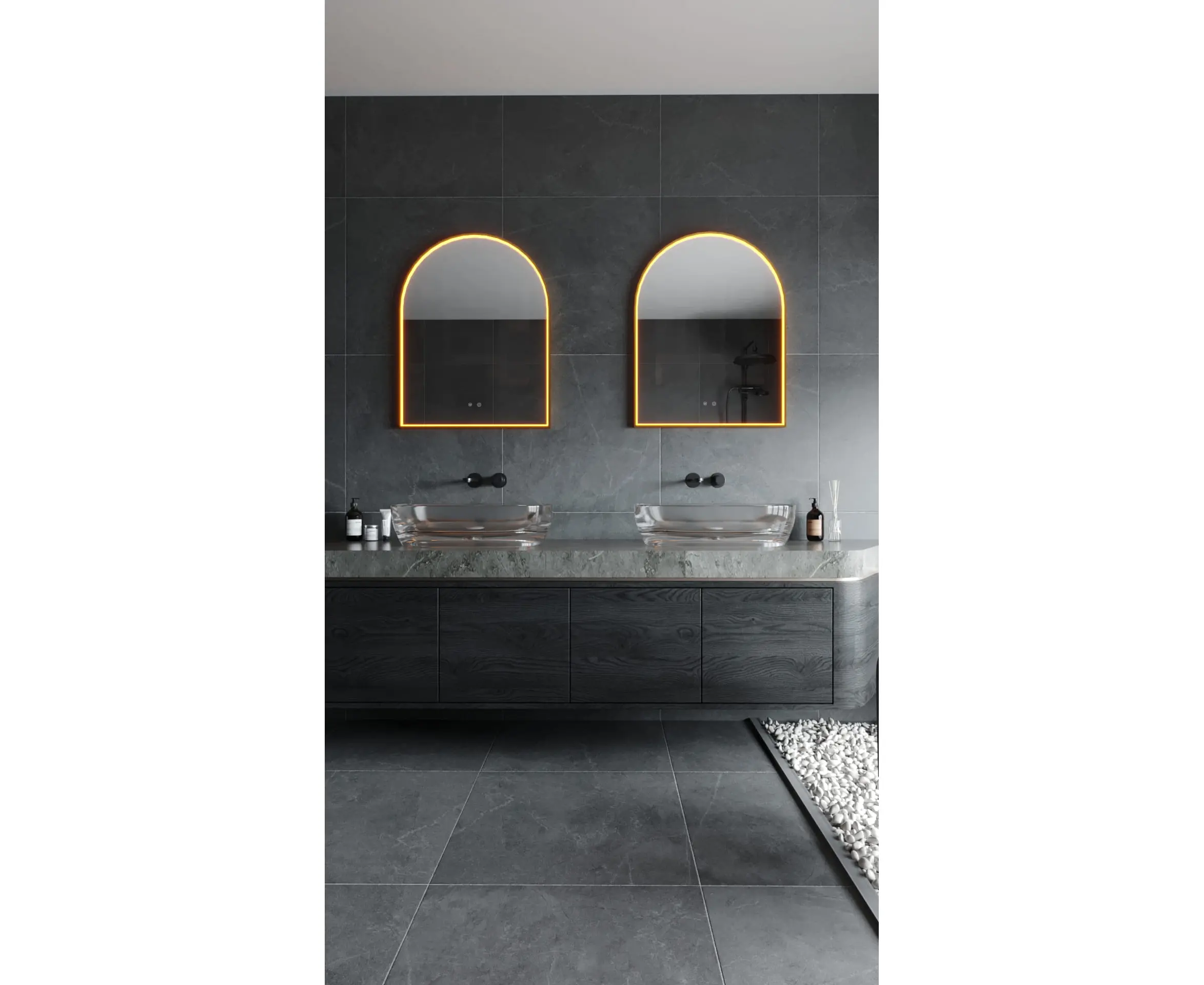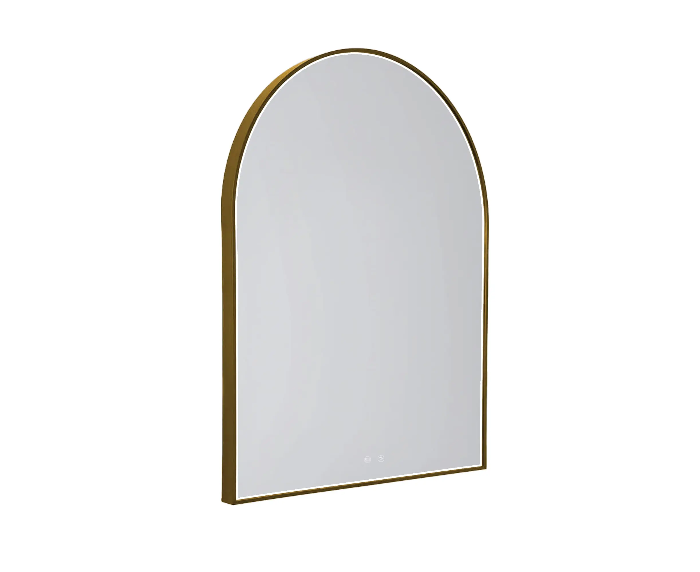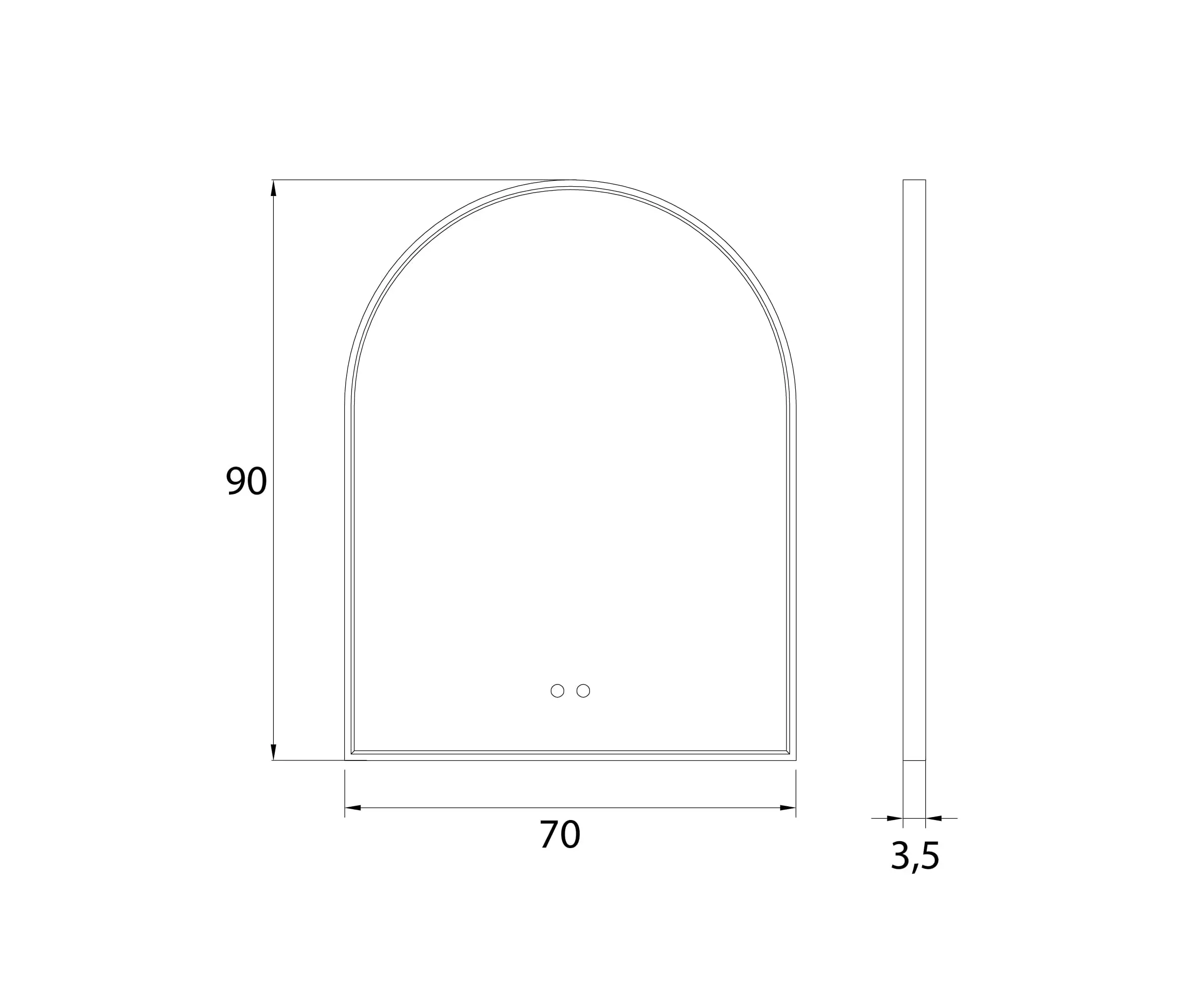 700mm x 900mm x 30mm (u dołu zaokrąglony prostokąt, u góry pełne zaokrąglenie+ramka / slightly rounded rectangular on bottom, fully rounded on the top + frame) 26W LED 230V, 3000K-5000K, IP44, 2070lm + 24W defroster Wykończenie/Detail finishing: złota szczotkowana ramka/gold brushed frame Materiał/Material/: metal, szkło/ metal, glass posiada włącznik dotykowy ściemnialny/ includes dimmable touch switch