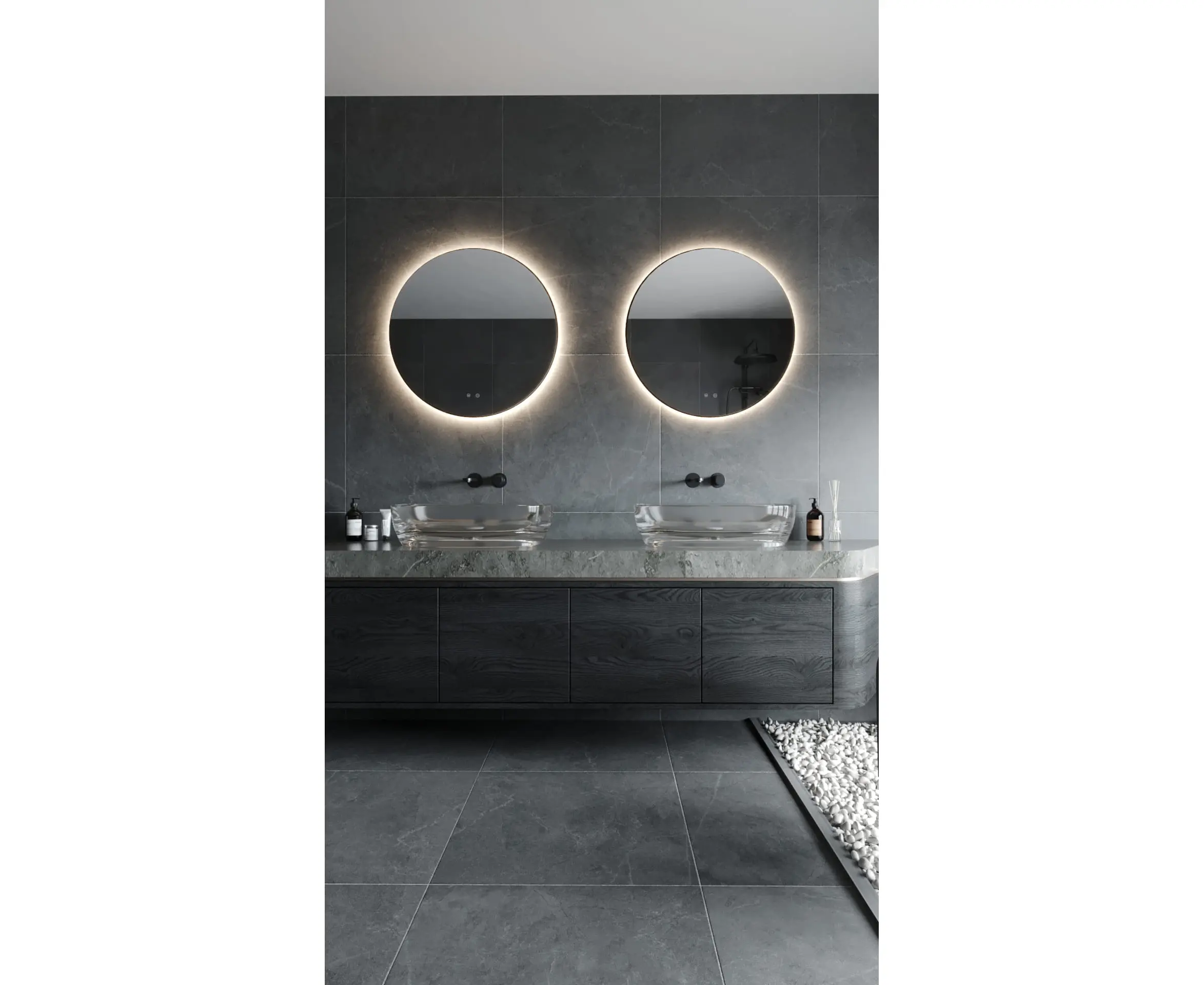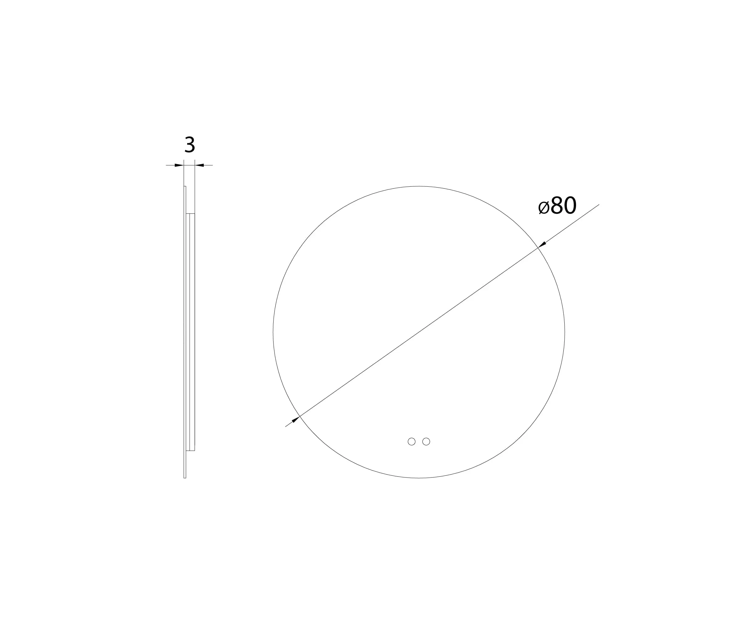 Ø800mm x 30mm (niewidoczna ramka/no frame visible) 22W LED 230V, 3000K-5000K, IP44, 2070lm + 24W defroster Wykończenie/Detail finishing: biała cofnięta ramka/white recessed frame Materiał/Material/: metal, szkło/ metal, glass posiada włącznik dotykowy ściemnialny/ includes dimmable touch switch
